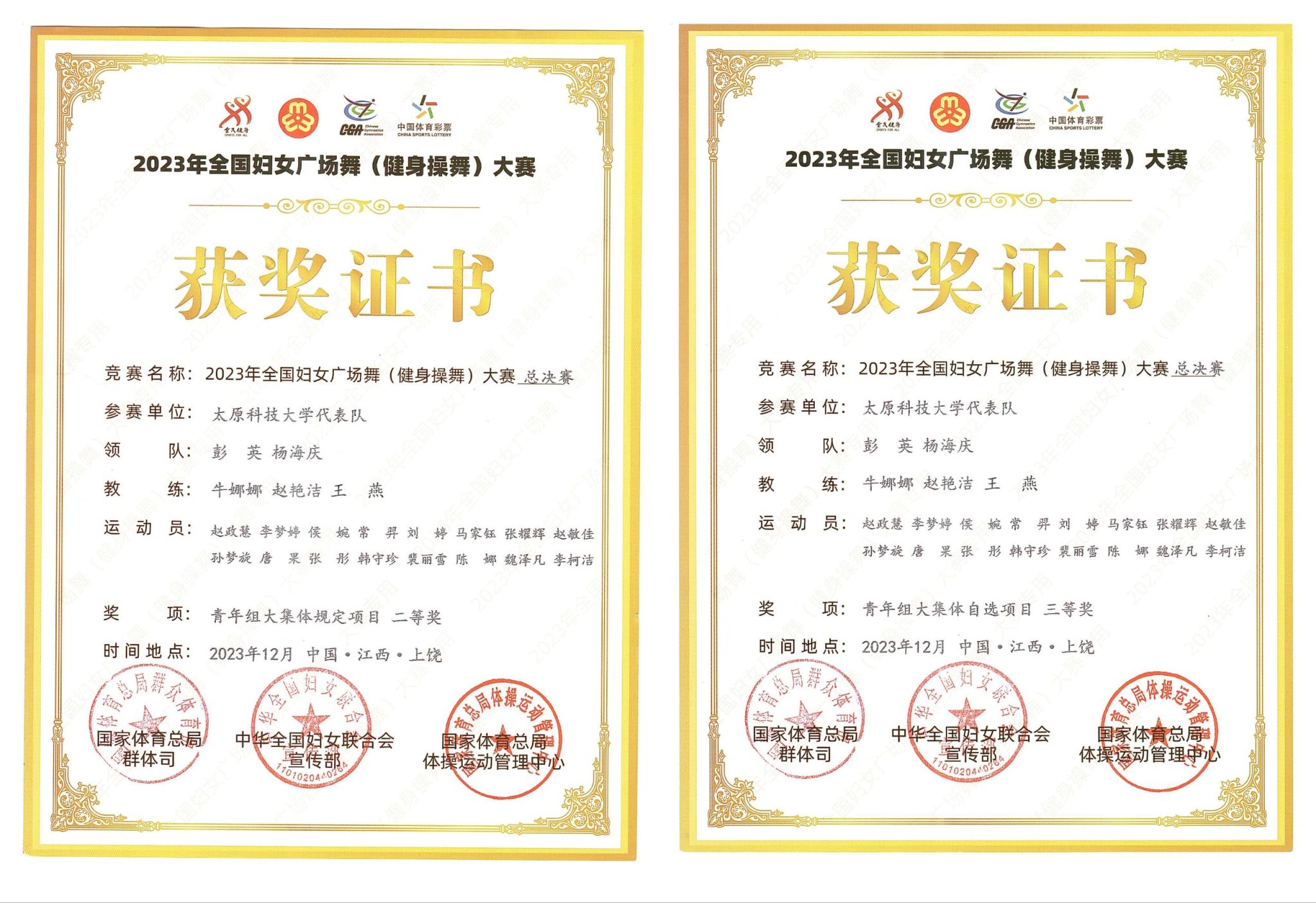 11月6日,金沙官网组建了2023年全国妇女广场舞(健身操舞)大赛总决赛参赛队—9159金沙游戏代表队,在体育学院牛娜娜、赵艳洁和王燕三名老师指导下,开始集中备赛训练。12月6日至10日,比赛代表队在校妇联副主席彭英、体育学院党委书记杨海庆的带队下,代表学校赴江西上饶参加大赛总决赛。大赛得到了分管校领导的高度重视和校工会、校妇联、体育学院的大力支持;赛前,校妇联副主席彭英和体育学院党委书记杨海庆亲自到训练场地给运动员加油鼓劲,勉励参赛运动员要刻苦训练,发扬敢打敢拼的科大精神,勇敢拼搏,勇创佳绩。